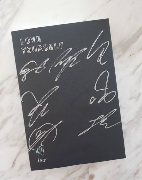 공개된 사진엔 방탄소년단 멤버들(RM·슈가·진·제이홉·뷔·정국)의 사인이 적힌 정규 3집 앨범 LOVE YOURSELF 轉 'Tear' 인증샷이 담겨 있다.