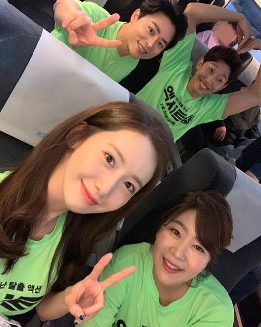 조정석과 소녀시대 윤아는 손가락으로 브이(V)를 그리고 있으며, 강기영은 큰 하트를 만들고 있다. 배우 김지영의 모습도 확인할 수 있다.