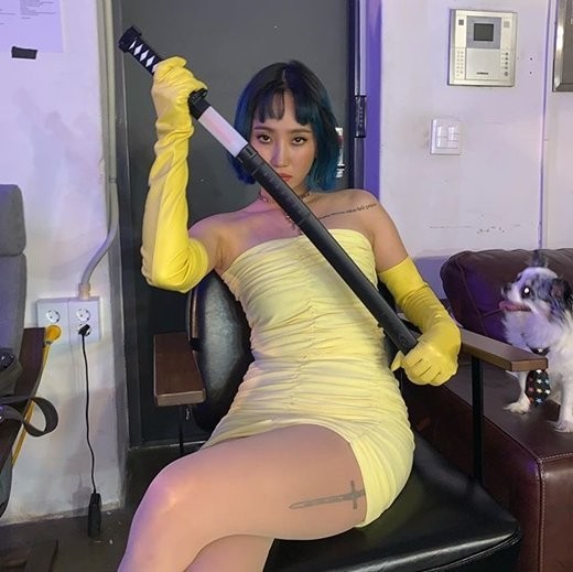 핫펠트는 2일 인스타그램에 "#killbill 내 칼 불 들어오는 장난감 칼인데 불 켜는 거 까먹음"이라고 적고 사진을 올렸다. 뮤직비디오 현장으로 보인다.