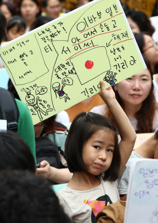 이날 시위에 참여한 중·고등학교 학생들과 시민 등 1000여명(주최 측 추산)은 노란 나비 모양 부채, 손팻말을 든 채 옛 일본대사관 앞 '평화로'를 지켰다.