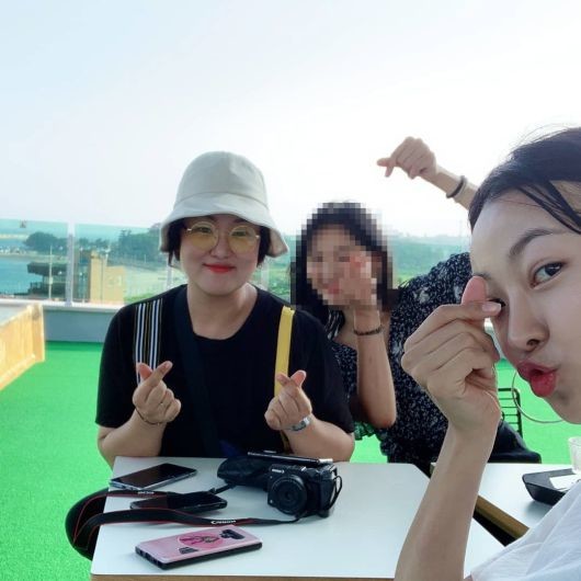 사진 속 하재숙은 모자에 노란색 틴트 선클라스를 쓰고, 검은 티셔츠를 입은 채 카메라를 보며 양손 손가락 하트를 하고 있다. 하재숙의 왼편에는 고원희의 친구가 하재숙 쪽으로 몸을 기울인 채 카메라를 보고 있고, 테이블을 사이에 두고 고원희가 몸을 돌린 채 카메라를 보고 있다. 고원희는 손가락 하트로 한쪽 눈을 가리고 입술을 내민 모습이다.