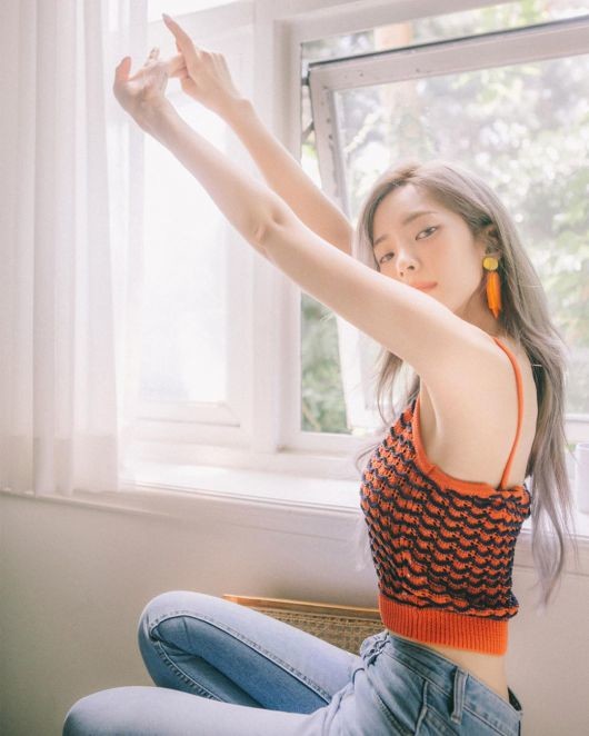 사진 속 헤이즈는 창가에 앉아있는 모습이다. 주황색 니트 나시에 청바지를 입고 양 손으로 기지개를 켜며 카메라를 쳐다보고 있다.