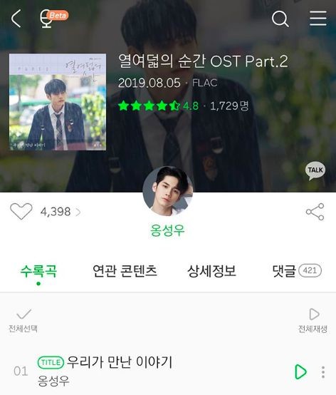 공개된 사진에는 옹성우가 부른 JTBC 월화드라마 '열여덟의 순간' OST '우리가 만난 이야기'의 음원 화면이 담겼다. 이에 그가 자신이 출연 중인 드라마의 OST주자로 직접 나선 점이 시선을 모았다.