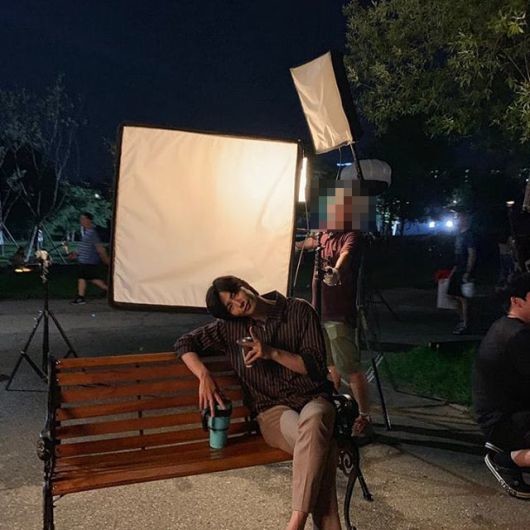 사진 속 송재림은 벤치에 다리를 꼬고 기대 앚아 한 손으로는 V를 다르 손으로는 민트색 텀블러를 들고 있다. 송재림은 줄무늬 셔츠에 베이지색 바지를 입고 있다.