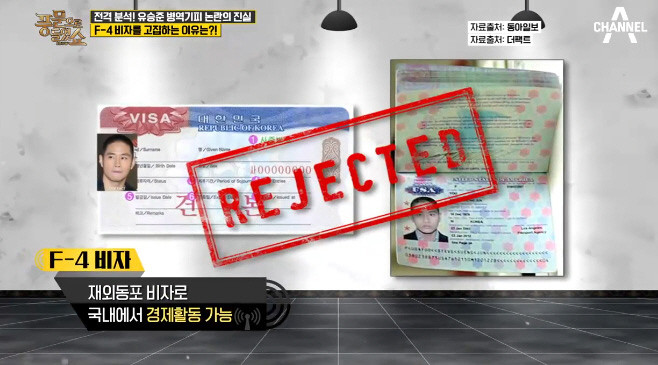 이날 한 연예부 기자는 “유승준이 아이들과 함께 고국에 돌아가고 싶다는 게 이유라고 했는데 한 가지 이상한 점이 있다”며 “일반적으로 외국인이 한국 왕래를 할 수 있는 C-3 비자를 발급받아 한국에 올 수 있다. 그런데 유승준은 비자 중에서도 F-4 비자를 신청했다”고 말했다.