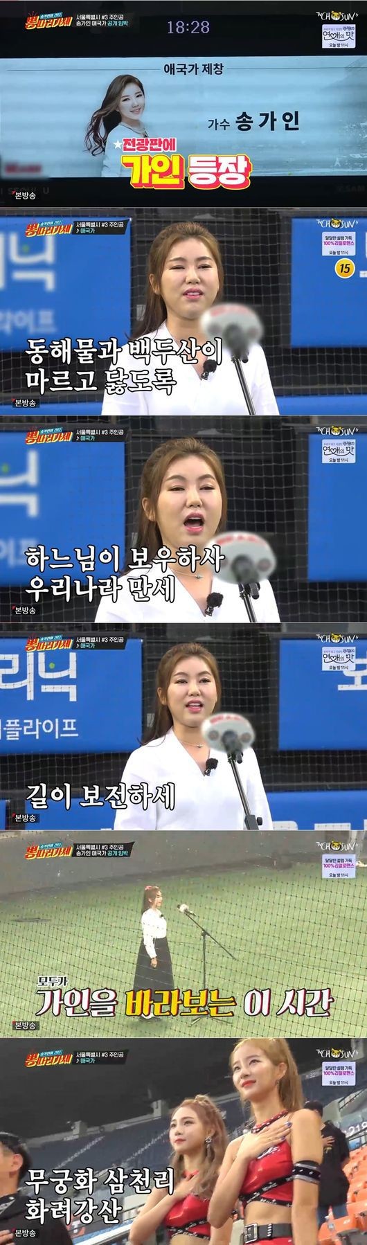 마침내 선수들 입장 후 송가인도 관중 앞에 섰다. 애국가가 공개임박한 가운데, 전광판에도 송가인이 소개됐다. 모두가 송가인을 향해 시선이 집중되면서 관중 모두 기립하며 엄숙한 분위기가 됐다. 수도 없이 부른 첫 소절이 야구장에 울려퍼졌고, 송가인은 천천히 애국가를 제창했다. 노래가 끝나자마자 관객들도 힘찬 박수소리로 화답했다. 국악스타일이 묻어나면서도 묵직한 송가인만의 목소리가 녹아든 애국가가 시청자들 마음까지 울림을 안기며 촉촉하게 적셨다.