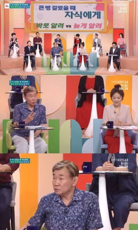 9일 방송된 KBS1 교양프로그램 ‘아침마당’은 ‘큰 병 걸렸을 때 자식에게 바로 알릴지, 늦게 알려야 할 지’를 주제로 방송인 조영구, 유인경, 배우 양택조, 남능미 윤문식, 아나운서 임수민, 개그맨 배영만 등이 출연해 이야기를 나눴다.