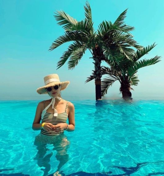 공개된 사진 속 기은세는 맑은 물이 인상적인 풀에서 포즈를 취하고 있다. 기은세는 스트라이프 패턴의 수영복을 입고 사랑스러운 모자를 쓴 채 화보같은 자태로 시선을 끌었다.