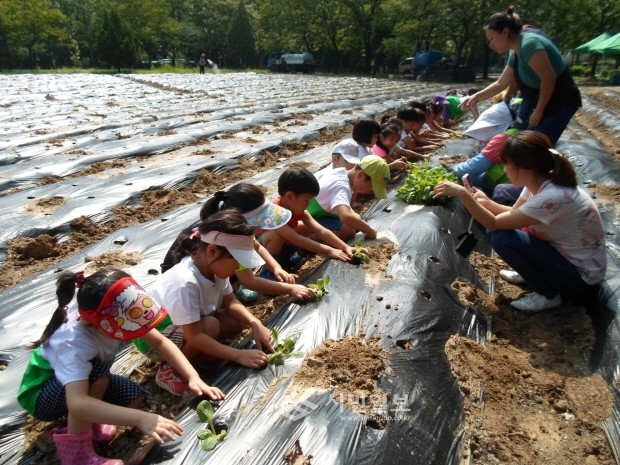 [시민일보]최근 구로구가 오류 IC 일대 1800㎡의 녹지대에 지역공동체 일자리 참여자와 지역내 어린이들과 함께 배추를 키워 불우이웃을 돕는다. 사진은 덕성어린이집 아이들이 녹지대 인근 주민들과 함께 오류 IC 일대 녹지대에 배추모종을 심고 있는 모습.