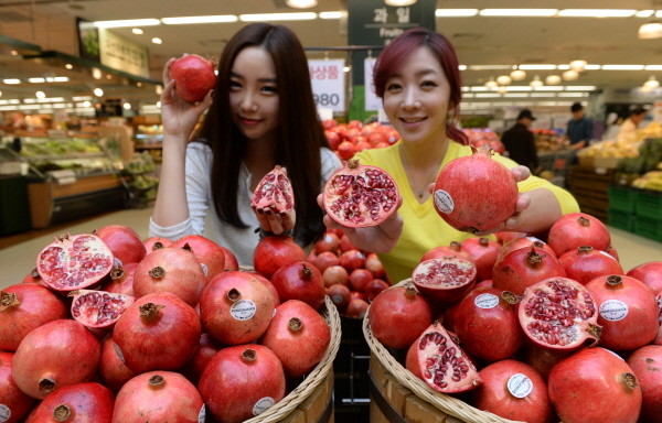 [시민일보]27일 오전 서울 용산구 이마트 농산매장에서 제철 맞은 석류2입(팩)을 5,980원(개당 2,990원)에 선보이고 있다. 석류에는 갱년기 장애에 좋은 에스트로겐이 들어있고 석류의 열매와 껍질은 고혈압과 동맥경화 예방에 좋다.