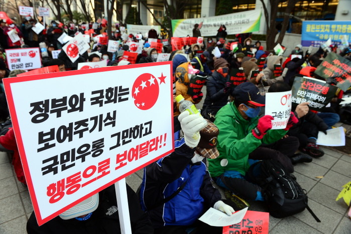 1일 오후 서울 영등포구 여의도 금융감독원 앞에서 열린 동양사태 해결을 위한 비상대책위원회 총궐기 대회에 참가한 피해자들이 손피켓을 들고 구호를 외치고 있다.