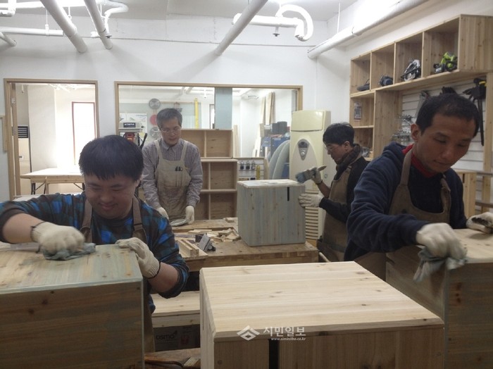 | ▲ 관악구의 '함께사는 세상'에서 지적장애인과 함께 운영 중인 'DIY 목공방' 모습. | ||