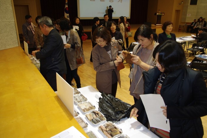 | ▲ 지난해 11월 열린 수산물 공동구매 품질평가보고회에서 학부모들이 전시된 식재료들을 살펴보고 있다. | ||