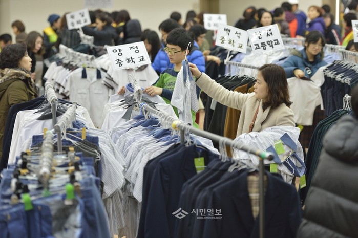 | ▲ 지난해 열린 '중·고생 교복 및 학생용품 교환장터'에서 참여한 학생들과 학부모들이 교복을 고르고 있는 모습. | ||