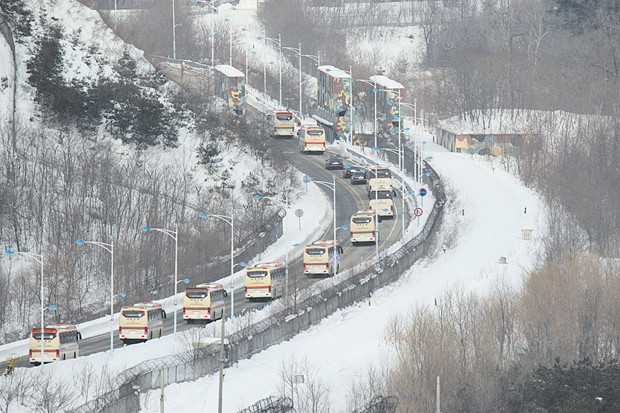 | ▲20일 오전 제19차 남북 이산가족 1차 상봉단이 CIQ 남북출입사무소에서 버스를 갈아타고 눈이 덮인 동해선 육로를 따라 금강산으로 향하고 있다. /뉴시스 | ||