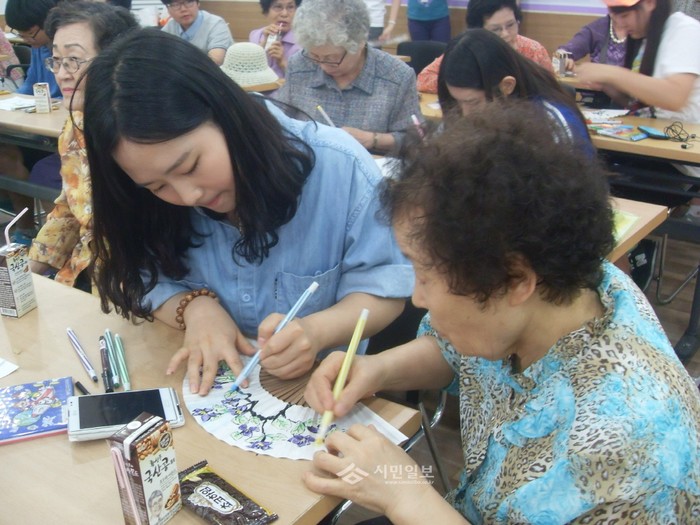 | ▲ 지난해 진행된 ‘세대공감-토요일이 좋아요’ 프로그램을 진행하는 가운데 노인과 청소년이 함께 부채를 만들고 있는 모습. (사진제공=도봉구보건소) | ||