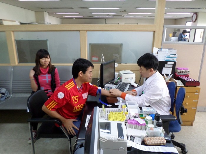 | ▲ 지난해 진행된 외국인 무료건강검진을 위해 보건소를 방문한 한 외국인이 혈액검사를 위해 채혈하는 모습. (사진제공=영등포구청) | ||