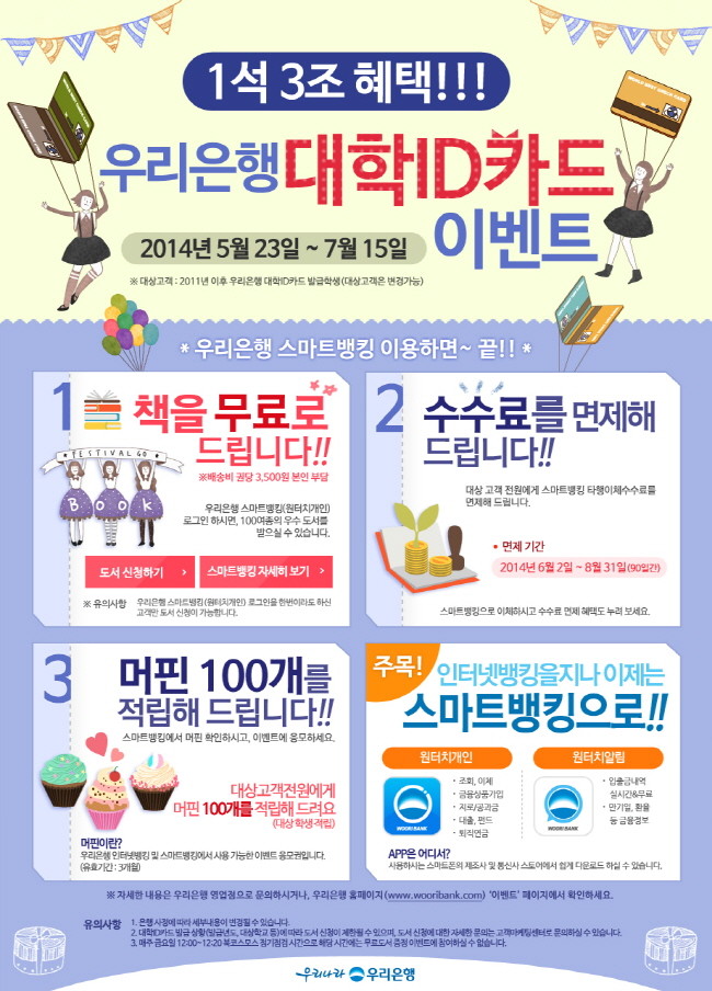 이번 행사는 우리은행에서 발급한 ID카드를 소지한 대학생들이 사용하지 않고있던 금융서비스를 지속적으로 이용할 수 있도록 유도하기 위한 이벤트로, 기존의 사용자는 물론 기간내 1회 이상 스마트뱅킹을 이용하기만 하면 무료 도서 증정을 비롯 3가지 혜택을 동시제공한다.