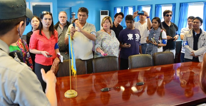 이달 15~20일 서울과 DMZ, 독도 등지에서 한국기자협회 주최로 열리는 '2014 세계기자대회'에 참가한 세계 각국 기자들이 17일 오전 경기 파주시 판문점 군사정전위 회담장에서 우리 군의 설명을 경청하고 있다.