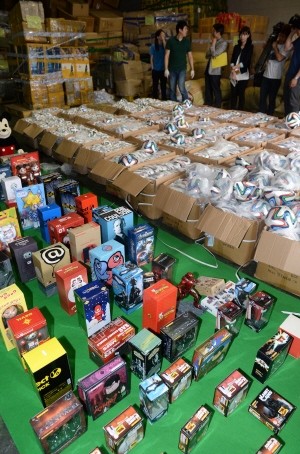 관세청이 17일 오전 인천 중구 항동 인천세관 제3세관 검사장에서 '선물용품 불법부정수입 집중단속' 결과의 적발 물품들을 공개하고 있다. 이번에 적발된 물품은 불법 복제한 닌텐도 게임 메모리칩, 완구, 인형 등 어린이용품이 주종을 이뤘고, 월드컵 특수를 노린 위조상표 축구용품(축구공)이 눈길을 끌었다. 관세청은 5월 가정의 달을 맞아 40일간(4.22~5.31) 실시해 67건, 505억원 상당의 물품을 적발했다.