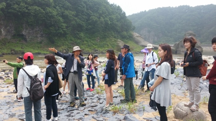 최근 경기 포천시와 (주)김영사가 공동으로 문화재청 천연기념물분과 위원장인 김학범 교수와 함께 떠나는 '포천시 한탄강 자연명승 답사'를 열어 '포천 화적연'등 한탄강 일대의 자연명승지를 방문하고 그 가치와 특징을 배우는 시간을 보냈다. 사진은 답사에 참여한 김학범 교수(왼쪽 네번째)와 참가자들의 모습. (사진제공=포천시청)