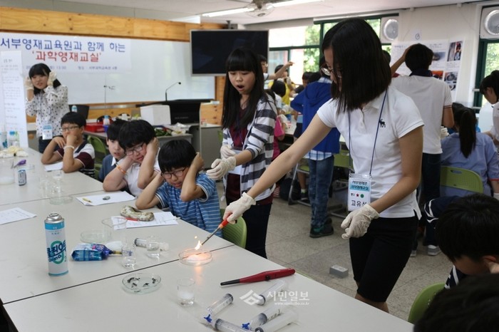 최근 인천 연수구 서부교육지원청에서 서부영재교육원 소속 3학년 학생 56명이 지역내 초등 영재학생들을 대상으로 재능기부를 하기 위해 '초등 영재학생들과 함께하는 과학영재교실'을 개최했다. 사진은 영재교실에 참여한 학생들이 실험에 집중하고 있는 모습.(사진제공=서부교육지원청)