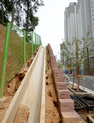 광주 남구 진월동의 A아파트 입주 예정자들이 18일 부실 공사 등을 이유로 건설사 측의 사전점검을 집단으로 거부하고 있다. 이들은 지난 13일부터 사전점검 거부 운동을 벌인 결과 140여가구의 참여를 이끌어냈다. 사진은 입주 예정자들이 안전성 문제를 지적하고 있는 아파트 입구 옆 옹벽 모습.