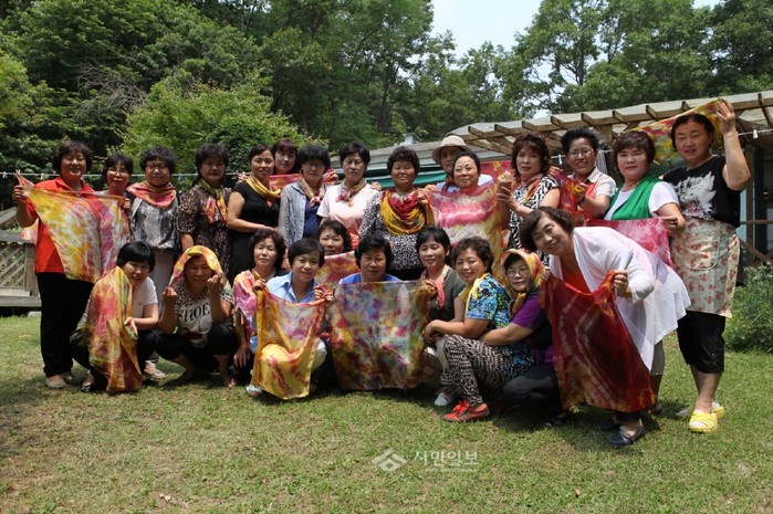 경기 이천시 백사면 생활개선회는 지난 18일 백사면 조읍리 김순자 농가에서 회원 36명이 참석한 가운데 '생활개선회 순회교육'을 실시했다. 사진은 이날 진행된 '자연에서 얻은 천연소재를 이용한 염색교육'에 참여해 염색으로 무늬내기 실습교육을 마친 참가자들의 모습. (사진제공=이천시청)