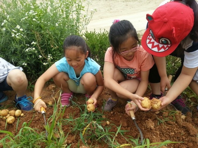 충남 아산시 신리초등학교는 지난 19일 텃밭가꾸기 체험활동으로 지난 봄에 심은 감자를 수확하는 시간을 가졌다. 지난 봄에 감자를 심은 것은 스스로 심은 감자를 수확하며 생명의 소중함을 느낄 수 있도록 한 것으로 이날 학생들은 호미로 감자를 수확하며 자신이 심은 감자가 얼마나 자랐는지 관찰하는 시간을 가졌다. 사진은 감자를 캐고 있는 학생들의 모습. (사진제공=아산교육지원청)
