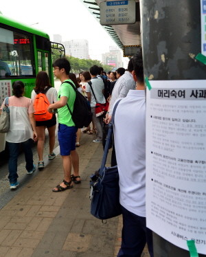 전국자동차노동조합연맹 광주버스노동조합이 총파업에 돌입해 버스 운행을 중단한 가운데 23일 오전 광주 서구 광주유스퀘어 광장 앞 버스정류장에서 시민들이 뒤늦게 도착한 버스를 줄지어 타고 있다. 광주시는 총파업에 대비하기 위해 대체인력을 투입했다.