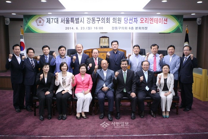 지난 23일 서울 강동구의회는 의회 6층 본회의장에서 제7대 구의회 출범을 앞두고 당선된 의원 18명을 위한 오리엔테이션을 개최해 효율적인 의정활동을 위한 전문지식과 의회운영 전반에 대한 사전 교육을 실시했다. 사진은 오리엔테이션을 마친 의원들이 기념촬영을 하고 있는 모습. (사진제공=강동구의회)