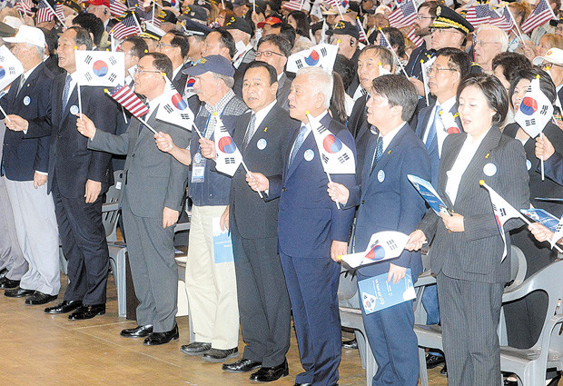 25일 오전 서울 송파구 잠실실내체육관에서 열린 ‘6.25전쟁 64주년 행사’에서 정홍원 국무총리를 비롯한 참석자들이 6.25의 노래 제창을 하고 있다.