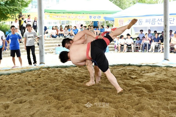 경기 광주시 광주공설운동장 씨름장에서 지난 27일 열린 '2014 씨름왕 선발대회'가 이날 초등부, 청년부, 여자부(60kg 이하), 여자부(80kg 이하) 4개 부문으로 선수들이 출전, 10개 읍·면·동 대항전으로 경기가 진행돼 열띤 경합을 벌였다. 사진은 청년부 시합을 벌이고 있는 선수들의 모습. (사진제공=광주시청)