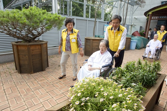지난 1일 민선6기 출범을 맞아 김우영 은평구청장은 취임식 행사 대신 시립평화로운집, 천사원, 인덕원을 방문해 ▲발마사지 ▲급식보조 등의 봉사활동을 실시했다. 사진은 김 구청장이 몸이 불편한 노인의 휠체어를 직접 밀며 산책하고 있는 모습.(사진제공=은평구청)