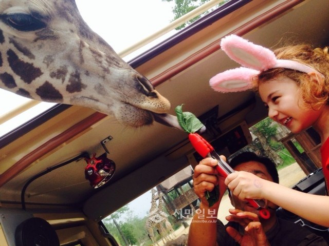 함께 용인 에버랜드에서 <멘토 ․ 멘티의 날> 행사를 가졌다. 이날은 로스트 월드 투어 프로그램, 동물 사육사 체험 등을 경험하며 멘토와 멘티의 정서적인 신뢰 관계를 더욱더 돈독히 했다. 사진은 용인에버랜드 ‘동물 사육사 체험프로그램’에 참가한 송파구 드림스타트 참가 어린이가 기린에게 먹이를 주고 있는 모습. (사진제공=송파구청)