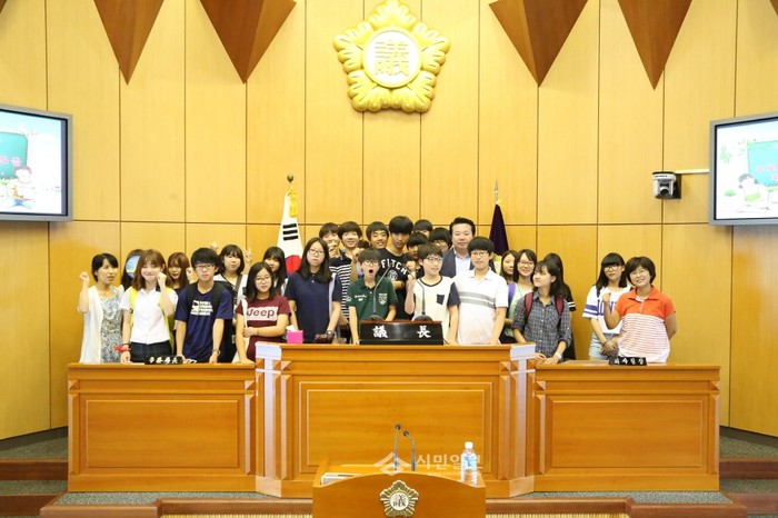 14일 서울 구로구의회에서 지역내 경인중학교 1·2학년 학생 30명을 대상으로 '2014 아버지 직업 체험행사'를 열어 구의회의 기능과 역할에 대해 배우고 직접 모의의회를 통해 조례를 제정하는 과정을 체험하며 민주시민의식을 키우는 시간을 보냈다. 사진은 이날 행사에 참여한 어린이들이 본회의장에서 기념촬영한 모습. (사진제공=구로구의회)
