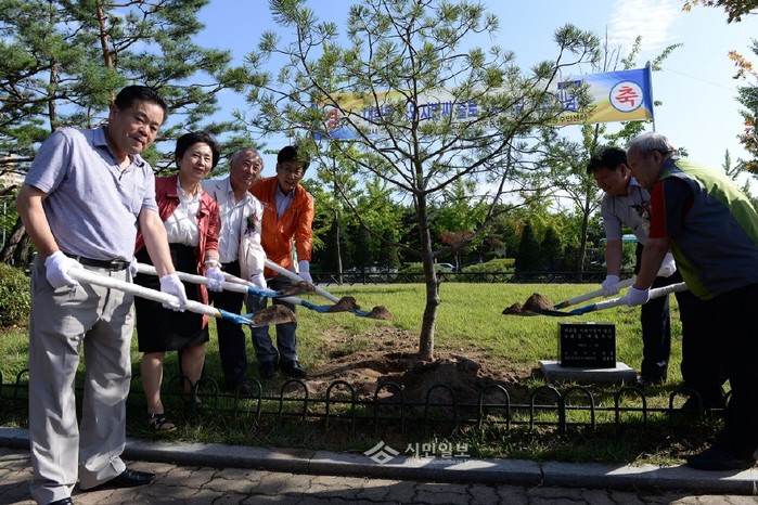 경기 고양시 일산서구 대화동 주민자치위원회는 지난 10일 자치공동체사업의 일환으로 조성된 대화동 가와지누리길 개통 기념 행사를 대화공원에서 개최했다. 가와지볍씨는 고양에서 보존하고 있는 가장 오래된 역사를 지닌 문화유산으로, 시는 가와지볍씨 출토의 의미를 재조명하고 역사의식 고취를 위해 가와지누리길을 조성했다. 사진은 개통 기념 식수를 심고 있는 최성 고양시장(왼쪽 네번째)및 관계자들의 모습. (사진제공=고양시청)