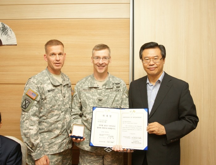 지난 15일 성장현 용산구청장은 해밀턴호텔에서 열린 '제2차 용산구 한미친선협의회 정기회의'에 한국측 위원장으로 참석해 한·미 상호간의 우호증진과 공동관심사에 대해 논의했다. 사진은 이날 회의에 참석한 성 구청장이 신규위원 위촉장을 전달하는 모습.(사진제공=용산구청)