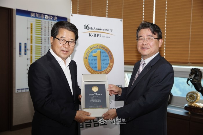 17일 경기 이천시는 5층 시장실에서 '2014 한국산업의 브랜드파워(Korea-Brand Power Index K-BPI)' 시상식을 열고 조병돈 이천시장(왼쪽) 및 이천시 농협 관계자 등이 참석한 가운데 '임금님표 이천'의 농산물 브랜드부문 8년 연속 대상 영광을 함께했다. (사진제공=이천시청)