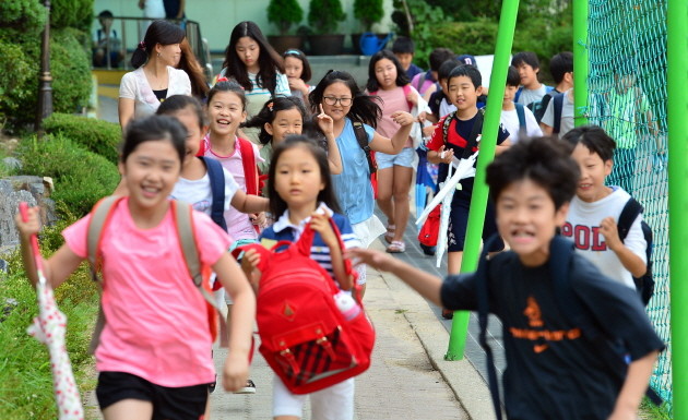 18일 오전 서울 영등포구 영동초등학교에서 여름방학식을 마친 어린이들이 집을 향해 뛰어가고 있다.