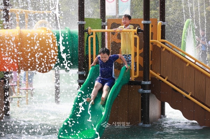 지난 18일 서울 영등포구가 영등포역 뒤편 영등포공원에 워터터널, 야자수버켓, 워터레볼루션 등의 물놀이 시설과 연식의자 등의 휴게시설을 갖추고 매일 오전 10시 30분부터 오후 6시까지 무료로 운영되는 400㎡규모의 물놀이장을 개장했다. 사진은 물놀이장을 이용 중인 어린이들의 모습. (사진제공=영등포구청)