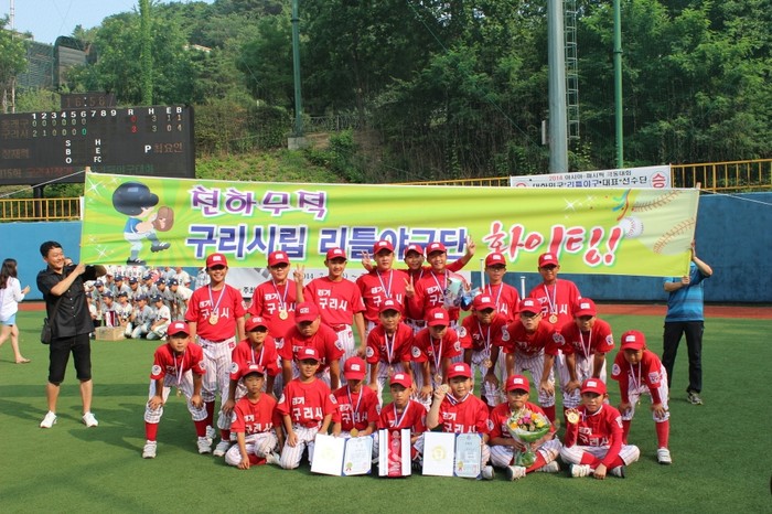 전국에서 82개팀이 참여해 지난 11~21일 11일간 서울 장충리틀야구장 외 2개 구장에서 열려 참여팀들이 실력을 겨룬 '2014 제15회 구리시장기 전국리틀야구대회'에서 2011년 이후 3년만에 구리시립리틀야구단이 우승을 차지했다. 사진은 우승 직후 야구단원들이 기념촬영 하고있는 모습. (사진제공=구리시청)