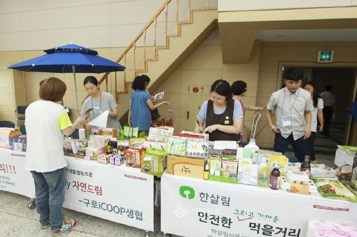 24일 서울 구로구가 구로구청 5층 강당에서 사회적 경제기업의 제품에 대한 정보를 제공하고 공공시장 판로 개척을 지원하기 위한 '사회적 경제와의 재밌는 소개팅'을 열고 제품 홍보, 구매 상담과 함께 사회적 경제를 주제로 한 토크쇼와 강연 등이 진행됐다. 사진은 참여자들이 자사 제품을 홍보하며 구매 상담 중인 모습. (사진제공=구로구청)