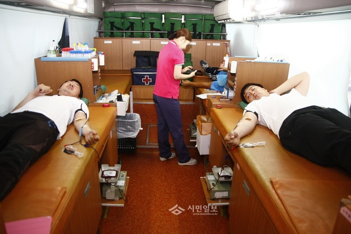 경기 포천시시설관리공단은 24일 임직원 50여명이 참여한 가운데 '2014년 사랑 나눔 헌혈 운동 및 헌혈증 기부 행사'를 하고 이날 모은 헌혈자 전원의 헐혈증서를 한국백혈병환우회에 기증하기로 했다. 사진은 헌혈활동에 동참한 포천시시설관리공단 직원들의 모습. (사진제공=포천시시설관리공단)