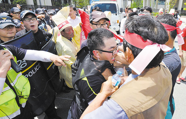 25일 오전 세종시 정부세종청사에서 전국농민회총연맹 충남도연맹 소속 회원들이 쌀 전면개방 저지 충남농민 투쟁 선포식을 열고 농림축산식품부로 진입을 시도, 경찰이 제지하고 있다.