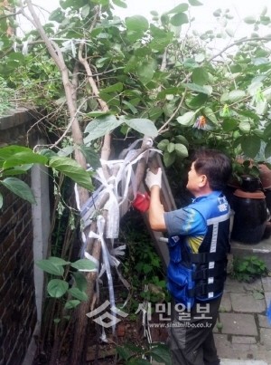 지난 7월31일 서대문구 홍제3동 자율방재단이 강한 비바람으로 인해 감나무가 담장으로 걸쳐 쓰러져 애를 태우던 지역내 주민의 주택을 방문해 나무를 치워주는 '수목제거 봉사활동'을 펼치고 있다. (사진제공=서대문구청)