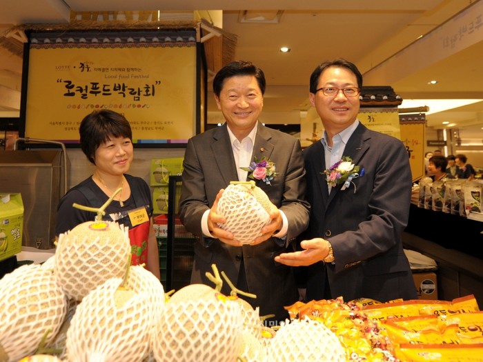 최창식 서울 중구청장이 최근 롯데백화점에서 자매도시 대표 농·특산물 202개 품목을 시중가격보다 10~50% 이상 저렴하게 판매하는 ‘중구 자매도시 로컬푸드 박람회 개막식’에 참가해 맛있게 익은 멜론을 들어보이고 있다. (사진제공=중구청)