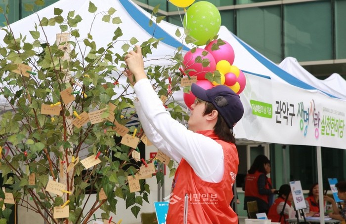| ▲ 지난 9월 '생명사랑 실천 한마당' 행사의 일환으로 구청광장에 설치된 생명나무에 희망의 메시지를 적은 후 걸고 있는 주민의 모습. | ||
