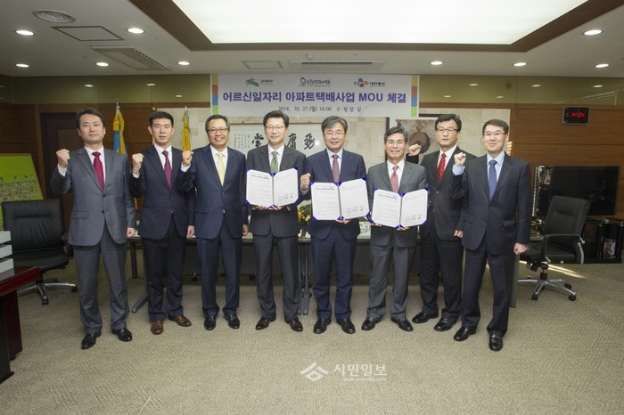 이를위해 구는 지난 27일 구청장실에서 한국노인인력개발원, CJ대한통운 등과 함께 '노인일자리 창출에 관한 아파트 택배사업' 업무협약(MOU)을 체결했다.