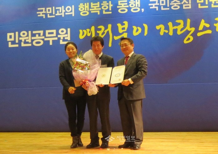 | ▲ 최근 열린 '2014 민원서비스 우수기관 인증제' 시상식에서 김기동 광진구청장을 대신해 이장병 민원행정팀장이 인증서 및 표창을 대리 수령하고 있는 모습. (사진제공=광진구청) | ||